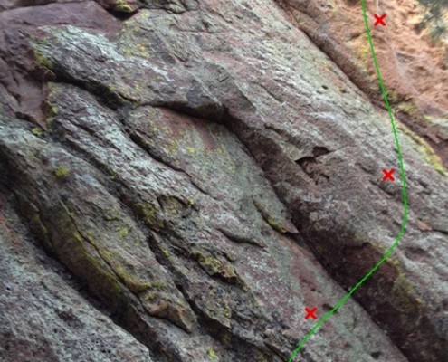 The proposed new route goes straight up a beautiful face for 40 feet to a ledge, about 15 feet of easier climbing up the ledge lead to an overhang. Once over the overhang, a rising traverse left leads to a rounded arête to the top. There is no natural protection on the route except on the ledge. One gear placement in this section could protect the run-out from the bolts on the lower half until you clipped the first bolt on the top half.
