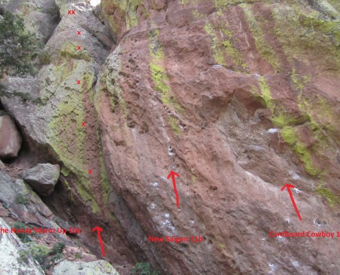 The proposed route is on the West Face of The Hand just left of the route New Saigon and will become the left most route on the wall. It has been red pointed on top rope at 5.10a and will make a nice warm up for the adjacent routes. It is approximately 45 feet long. The crux of the route starts off the ground and may require a stick clip due to the nature of the terrain.