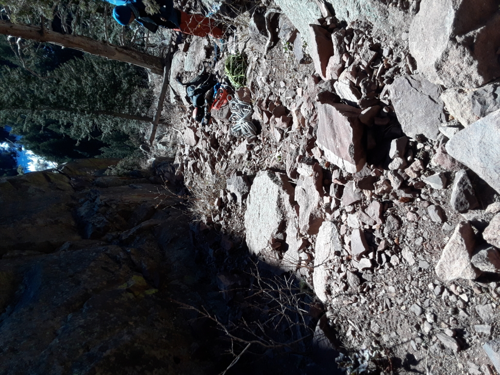 The staging area at the base of the climb is the same as that used by parties on the popular Captain Beyond route. It is composed of rocks and dirt, with a few small shrubs (Oregon grape) on the edges.  (see above photo).