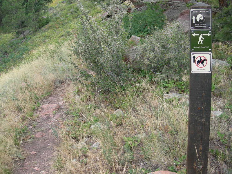 The approach is the same as that for any of the Mickey Mouse routes. We prefer parking at Eldorado State Park near the Bastille formation, hiking up the Bastille West Face trail to the Fowler Trail, and then take a left turn. Follow the Fowler trail to the Goshawk trail and go right. After about 0.75 miles, the Mickey Mouse access trail forks off right from the Goshawk trail. Follow this trail to just below the train tracks, and then follow a thin trail on the hillside left of the tunnel entrance. Cross the tracks just south of the south end of the tunnel, and head up the trail that skirts the base of Mickey Mouse. The total approach time is 1 hour for fit parties moving quickly, or perhaps 1.5 hours for most parties. The trail surfaces are mostly packed dirt, rocks, and talus in places, especially near the base of the cliff.  There are a few other options from different trailheads.
