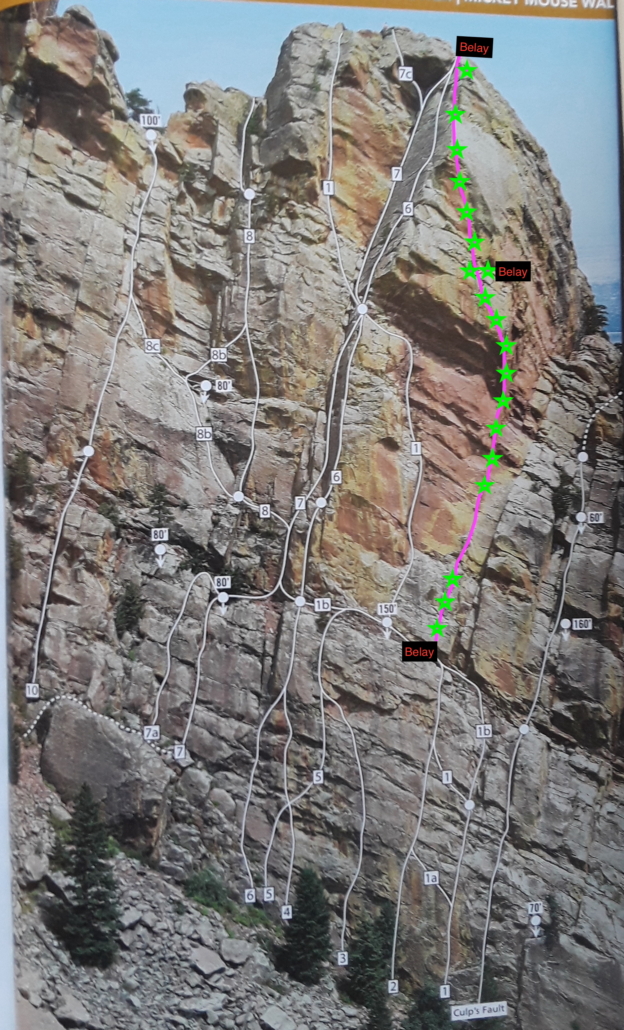 Culp’s Fault (5.8+) is located about 15 feet right (downhill) of the start of Captain Beyond (5.10c, trad, 4 pitches). As indicated above, the proposed route starts on a big ledge system after climbing the first two pitches of Captain Beyond. Continuing downhill to the right are Amusing (5.8+ R trad), Three Musketeers (5.11c sport), Mighty Mouse (5.12a sport), and Simian’s Way (5.11b trad). More routes exist on the South Tower further downhill of these routes.
