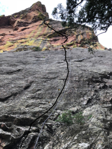 Additional notes: The natural line of climbing on the upper pitch trends left from the end of the first pitch so it requires a second top rope anchor located on the North summit to access the second pitch. The top rope anchor for the first pitch is located approximately 40 feet below the North summit and about 30 feet to the right on the shoulder of the NW summit.