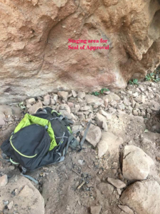 The staging area at the base is compact dirt and gravel, with no pre-existing vegetation (it’s under a very overhanging part of the wall, in the rain shadow)