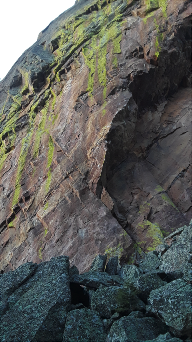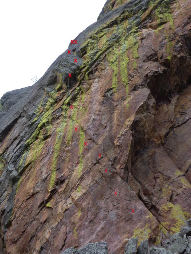 The proposed route is roughly 30 meters long, and can be descended with a single 70m rope (and possibly a 60m).  The route would end at a sloping ledge about 20’ below the true summit, past which the climbing deteriorates. The applicants propose to use 12 bolts total: 10 lead-protection bolts, as well as two additional bolts for the top anchor.  The seam feature itself is shallow and does not offer any reliable natural protection.