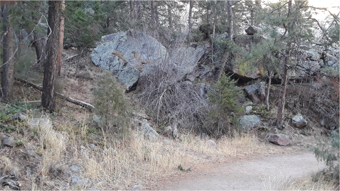 The spot where you leave the Shadow Canyon trail for the climber access trail: