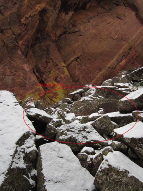The staging area is talus with some flat boulders at the base of the climb.  There is little or no vegetation in this area, and no soil. There is ample space for multiple parties to stage on both this route and any neighboring climbs.  Because the approach is shared with other popular routes, and the staging area is all rocks, little additional impact would be created by adding the proposed climb