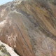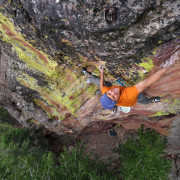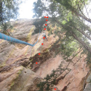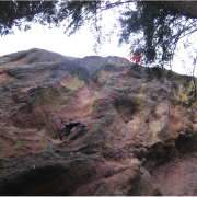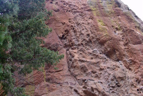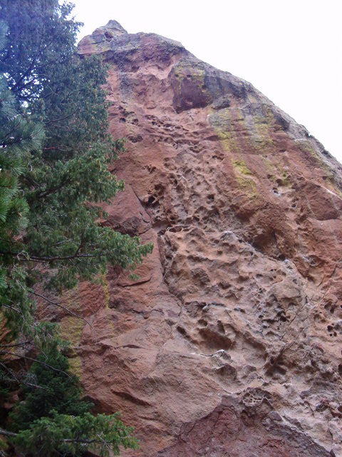 Tracks Are for Kids (5.10): FA: as a toprope, unknown; as a lead, Steve Annecone: Tracks Are for Kids is the left of the three bolted lines on the overhanging, west-facing hueco’ed fin of rock on the west-southwest side of the Dinosaur Rock formation. To get here, hike up into the notch below the west side of Dinosaur Rock, then pick your way down the  gully that leads south into Bear Canyon; take care to stay on rock slabs to mitigate erosion. Climb five bolts past consistently overhanging huecos to a new set of anchors at the lip, installed March 2012 to replace the existing, rusty-chain anchors. Very fun climbing!